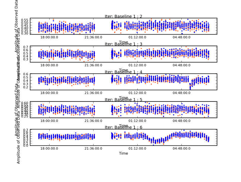 Check the logger and inspect the solutions caltable=prefix+'_self1.phcal' xaxis='time' yaxis='phase' subplot=611 iteration='antenna' plotrange = [-1, -1, -180, 180]
